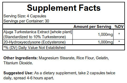 Uzbekistan Ajuga Turkestanica is also known as Turkesterone. Turkesterone is an ecdysterone, and is found naturally occurring in all plant and animal life and is all Natural. Turkesterone is an ecdysteroid found in plants and insects. This ingredient is believed to be one of the strongest natural supplements right now for fat loss, muscle building, improving focus and increasing muscle recovery. This ingredient is also used in traditional eastern medicine to treat digestion issues, cardiovascular issues, and aches. The study "The Anabolic Properties of Turkesterone phytoecdysone and turkesterone tetraacetate in experiments" showed that this ingredient successfully maintained the integrity of aged skeletal muscles.** This ingredient also aids in improving and accelerating workout recovery. It works by speeding up muscle tissue repair and stimulates protein biosynthesis. This is important and allows you to get back in the gym faster and build more muscle without having to take extra time off to recover.